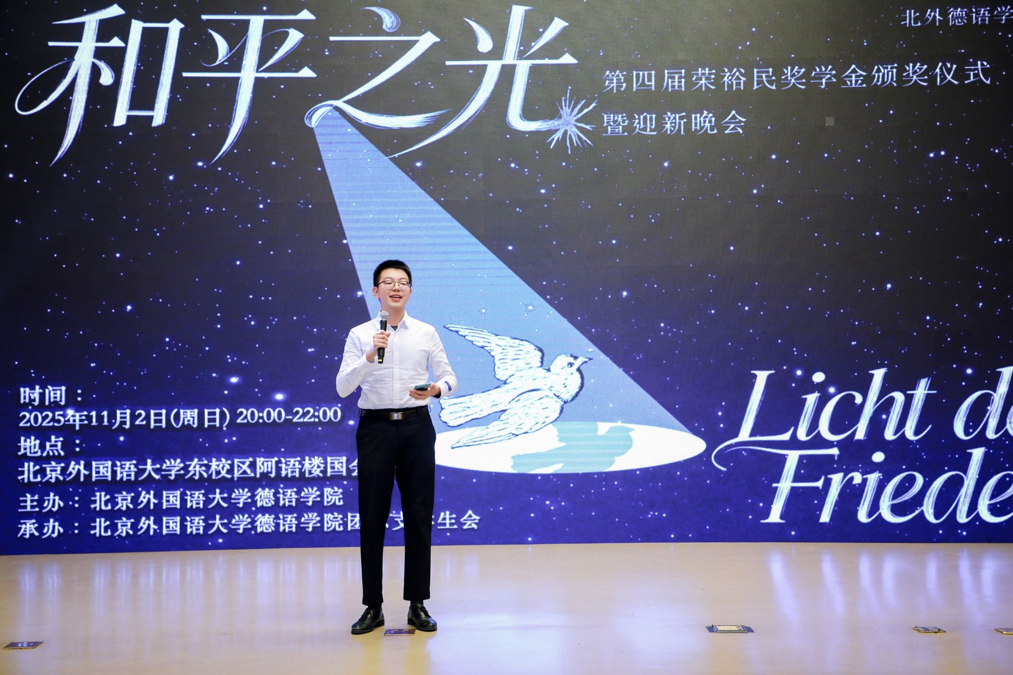 颁奖仪式举行前,他全程参与第四届德语学科区域国别研究高端学术论坛,并在致辞中表示将提高资助力度,支持更多母校德语学子“走出去”看世界。颁奖仪式上,荣裕民先生发表致辞。他结合自身求学、工作经历,深情讲述了设立基金的初心,强调德语作为跨文化交流桥梁的重要价值。他嘱托在场学子,要以扎实的专业素养立足国际舞台,以开放的视野联通世界,传承和平薪火,书写新一代北外德语人的精彩故事。同时,他对获奖同学表示热烈祝贺,鼓励全体学子坚守理想、深耕专业,不负时代使命与母校栽培。